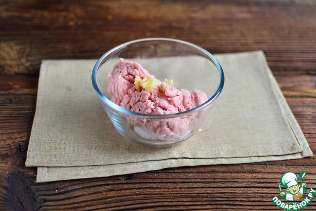 В фарш добавить чеснок через пресс, соль, перемешать.