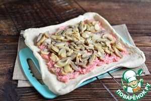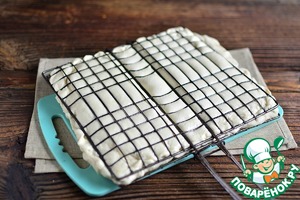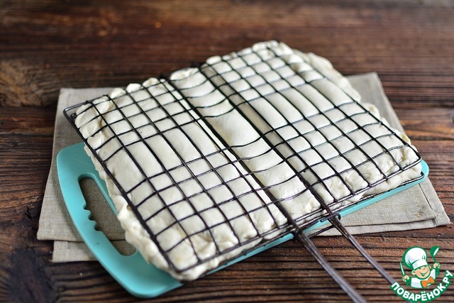 Раскатать один пласт теста по размеру решетки (не слишком тонко), решетку смазать маслом, выложить на нее теста, чтобы немного свисали края.
