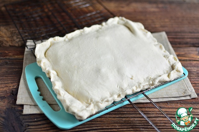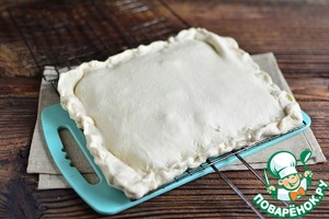 Второй пласт теста также раскатать и накрыть пирог, края защипнуть.
