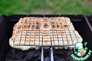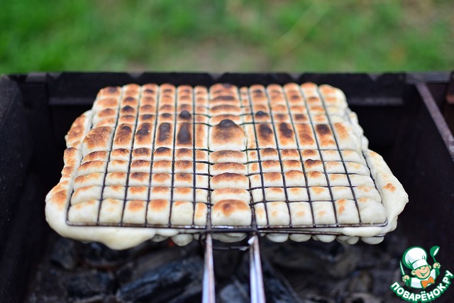 Жарить на умеренно-жарких углях, часто переворачивая, чтобы не сжечь тесто, до готовности. У меня ушло минут 10-15.