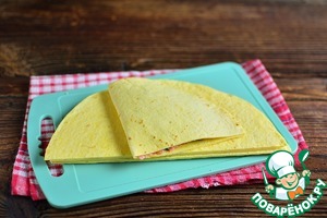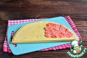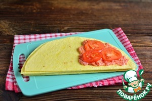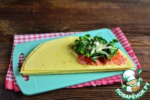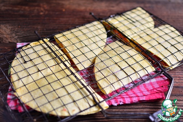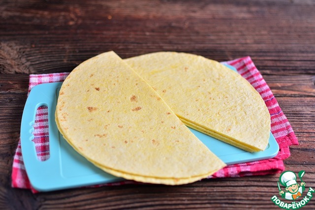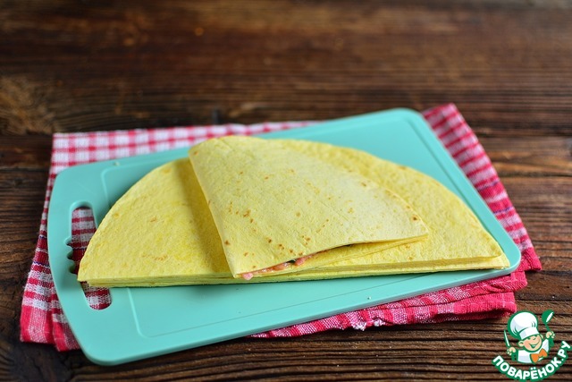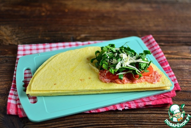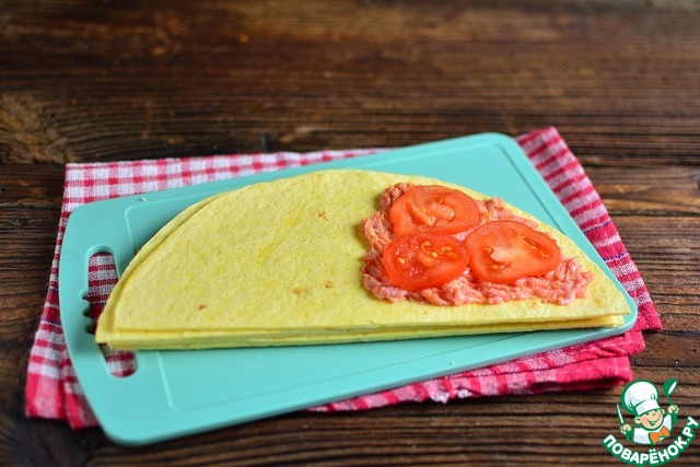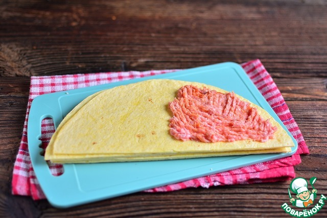 На одну часть разрезанной тортильи выложить фарш (не толстым слоем)