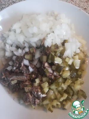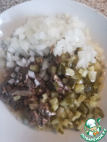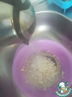 Нарезать лук, ошпарить кипятком, что бы не горчил