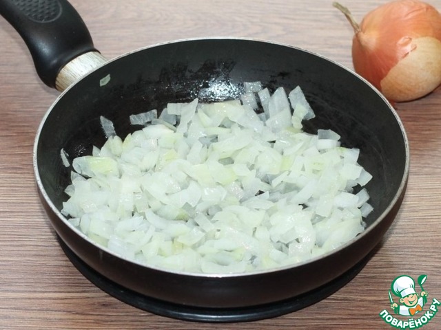 1. Приготовим соус. Репчатый лук очистить и мелко нарезать или натереть на терке. Затем обжарить на сковороде в растительном масле (2 ст. л.) до прозрачности.