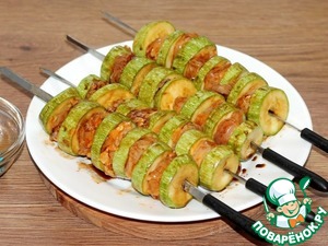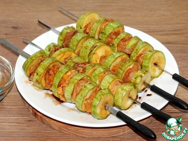 10. Замаринованный шашлык насаживаем на шампура, чередуя с кабачком. Получилось 4 порции шашлыка.