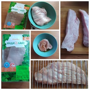 Я буду в салате использовать филе грудки индейки ТМ ИНДИЛАЙТ. Упаковка весом 500 г. Я буду делать салат для двоих и разрежу грудку на 2 одинаковых куска. Для салата я возьму один кусок весом 250 г. Его я натру перцем и солью, полью оливковым маслом. Индейка свежая и я её долго мариновать не буду. Положу на решётку и запеку. Это быстро, минут 15. -