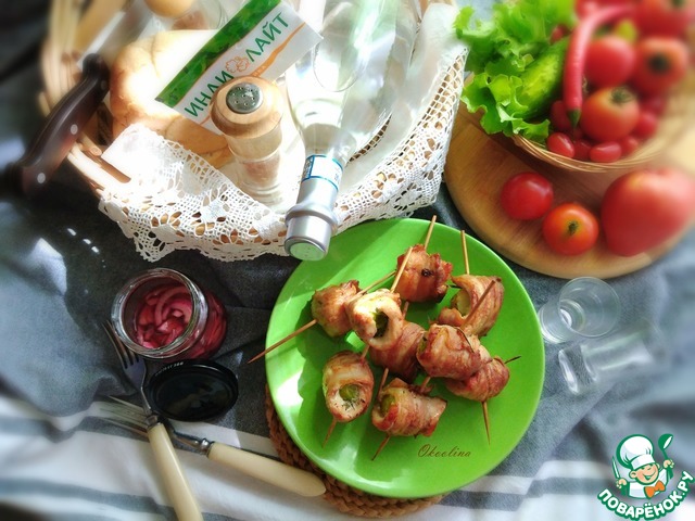 Такая оригинальная и вкусная закуска получится и в домашних условиях. Так же можно запечь рулетики под грилем в духовке на протвине. Подойдёт закуска к любому празднику и торжеству.