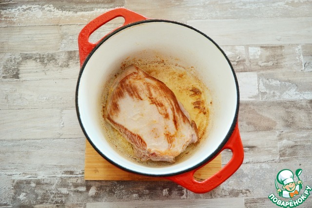 В толстостенной кастрюле раскалите масло и обжарьте кусок индейки со всех сторон