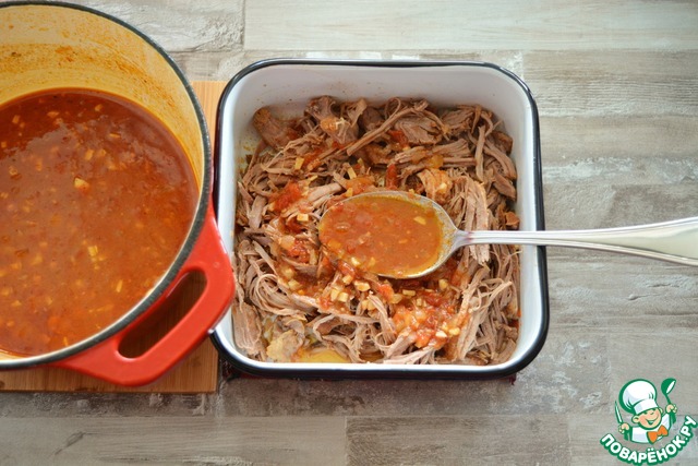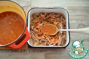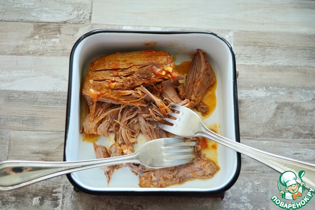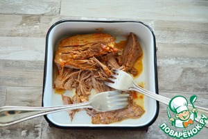 Выньте индейку из соуса, при помощи двух вилок порвите её на волокна