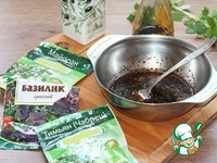 3. Приготовим маринад. Смешиваем масло с соевым соусом. Добавляем по щепотке пряные сухие травы: базилик, майоран и тимьян.