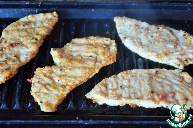 Слайсы индейки смазать растительным маслом и приготовить на гриле,