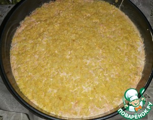 Дно разъёмной формы d=24см. застелить пергаментом, смазать сливочным маслом и выложить будущую запеканку. По желанию посыпать верх пшёнными хлопьями.