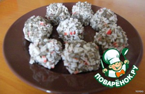 Скатайте небольшие шарики,обваляйте в измельченных крабовых палочках.