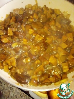 Грибы очищаем от лесной грязи, можно чуть чуть обмыть, но не замачивать, нарезаем крупными кубиками. Лук я нарезала кубиком и отправила обжариваться на растительном масле, минут 5, затем добавила грибы. Тушим наши грибочки до выпаривания жидкости.