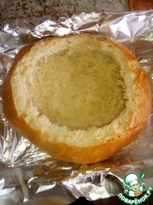 • Берем хлебушек, срезаем макушку, убираем мякиш. получается вот такой горшочек.