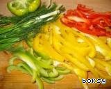 Приготовить начинку, порезать полосками сладкий перец.