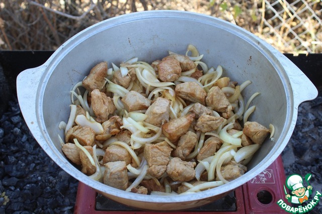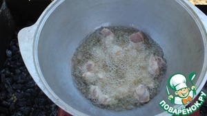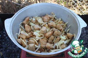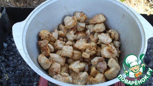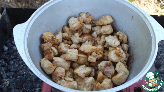 Из казана сливаем лишнее масло, оставляем 150 мл. Выкладываем мясо.
