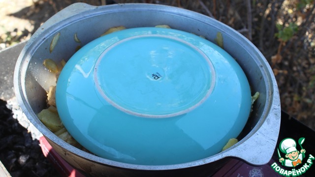 Накрываем тарелкой, чтобы жидкость медленее испарялась. Прикрываем крышкой и тушим 50-60 минут до готовности.