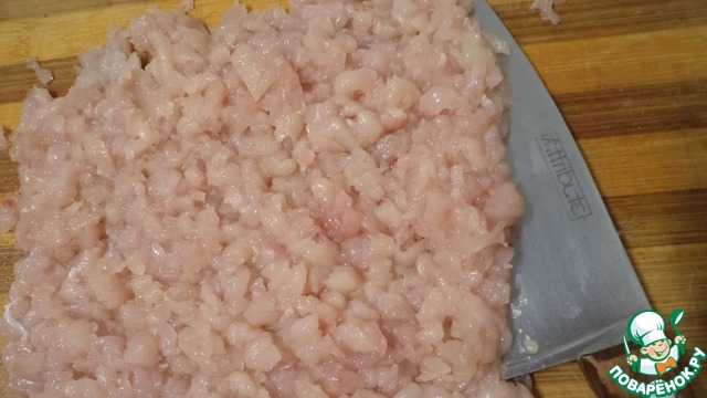 Филе грудки мелко порезать и порубить на доске ножом. Мелко порезать лук.