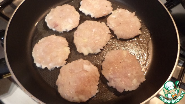 Растопить масло и положить сформованные плоские котлетки высотой около 1 см, по диаметру чуть меньше булочек.