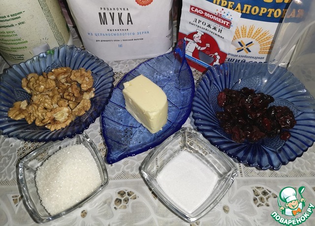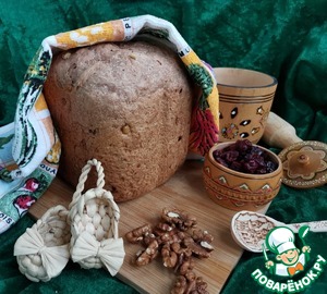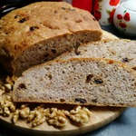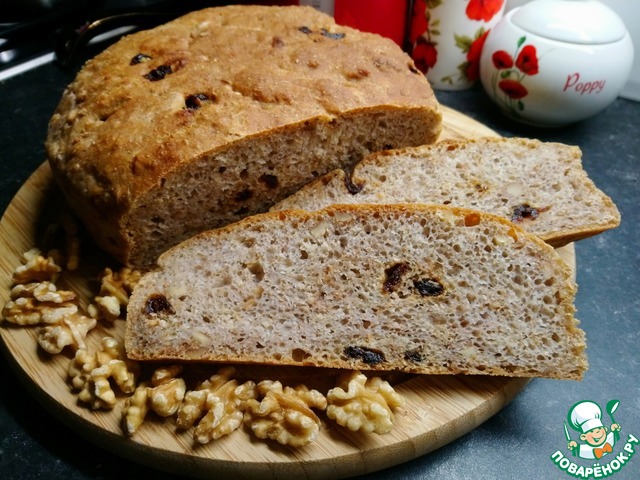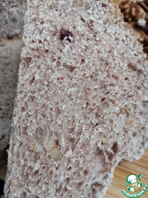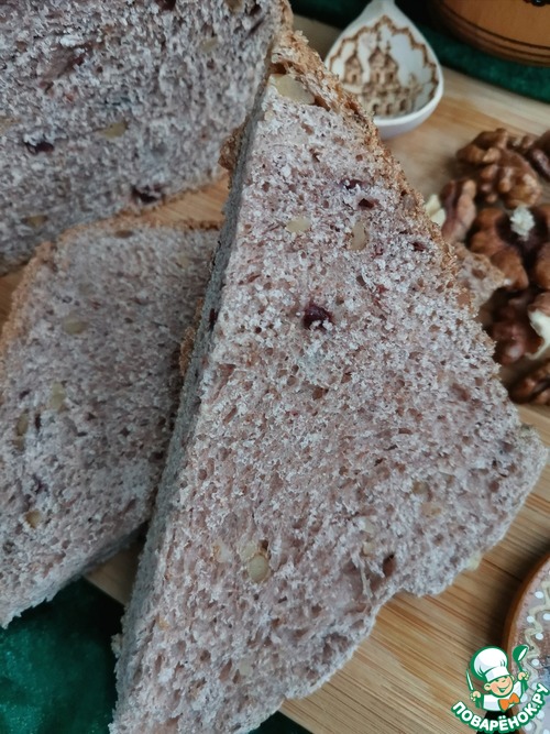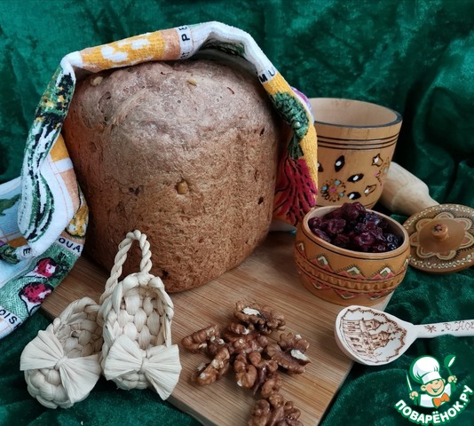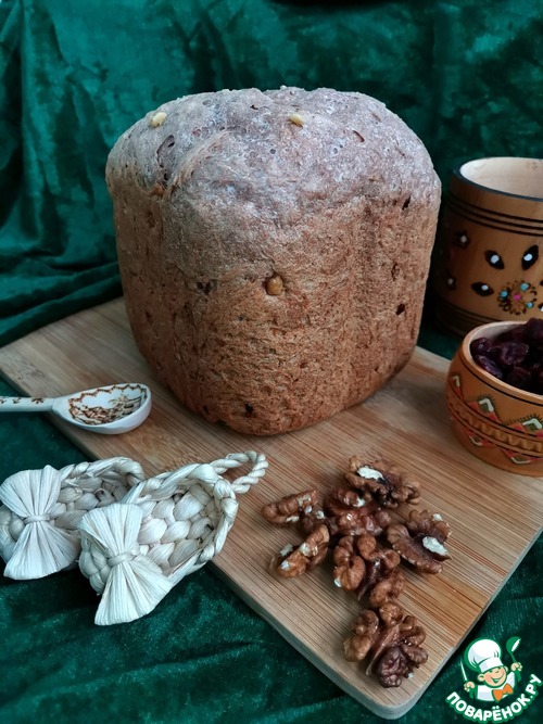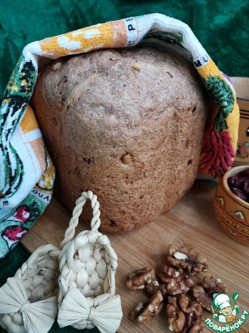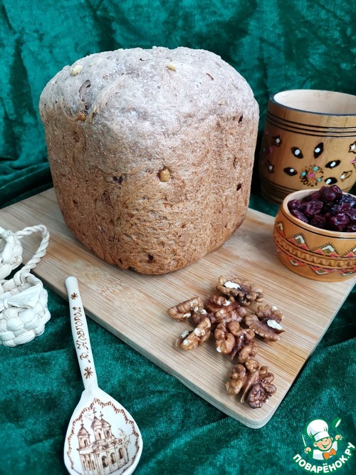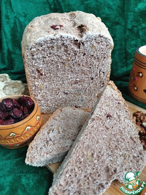 Пробовала похожий хлеб, когда ездила с экскурсией в Великий Новгород. Попыталась воссоздать и, кажется, получилось. Несмотря на наличие в рецепте вяленой клюквы и грецких орехов, хлеб не десертный! С хрустящей корочкой, чуть плотноватой структурой и самобытным вкусом. Угощайтесь!