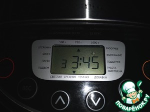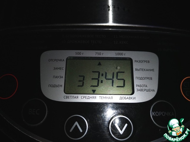 Установить режим выпечки. У меня программа "сдоба". Время выпечки - 3.45 минут, вес - 750г, корочка - средняя.