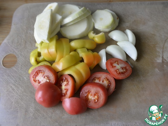 Овощи моем, чистим, режем: лук крупными перьями, помидор крупными кольцами, перец полосками, цуккини кольцами или полукольцами.