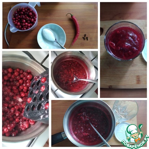 Соус нужно сделать дома и взять с собой на пикник. Он подойдёт к любому мясу. Бруснику я взвесила. Взяла 180 г. Высыпала в кастрюлю, поставила на огонь и размяла мялкой. Я люблю, чтобы брусника чувствовалась в соусе. Можно её так же разбить блендером. Это по желанию. Положила к бруснике 3 шт гвоздики, сахар и перец чили, отрезав от него 2 см. Убрала зёрнышки и нарезала колечками тонкими. Их у меня получилось 7. Довела до кипения и немного уварила соус, буквально 5 минут. Готов. Переложила в подходящую баночку с крышкой. Впрок не нужно его готовить, хотя он в холодильнике дней 5 простоит. Соус подойдёт к любому мясу. Я сделала его сегодня к индейки.