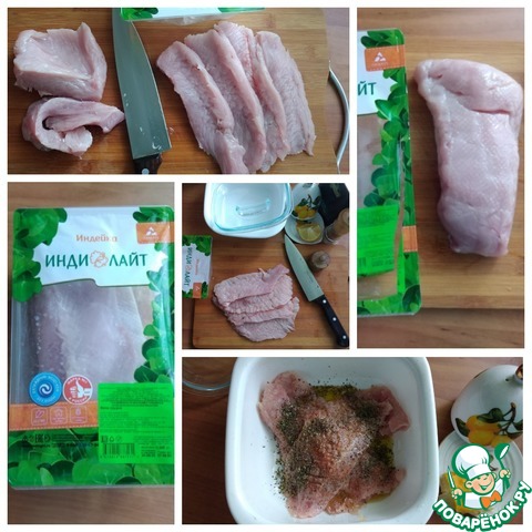 Я буду использовать сегодня филе индейки ТМ ИНДИЛАЙТ. Вес-500 г. Отрежу на двоих 4 куска примерно 300 г, толщиной 1,2-1,5 см. Кусочки отобью тупой стороной ножа с обеих сторон. Замариную. Положу кусочки в посуду, посолю, поперчу, добавлю сухой базилик, налью масла и отожму сок из половинки лимона, перемешаю руками. Пусть постоит мясо минут 15 под крышкой, промаринуется.