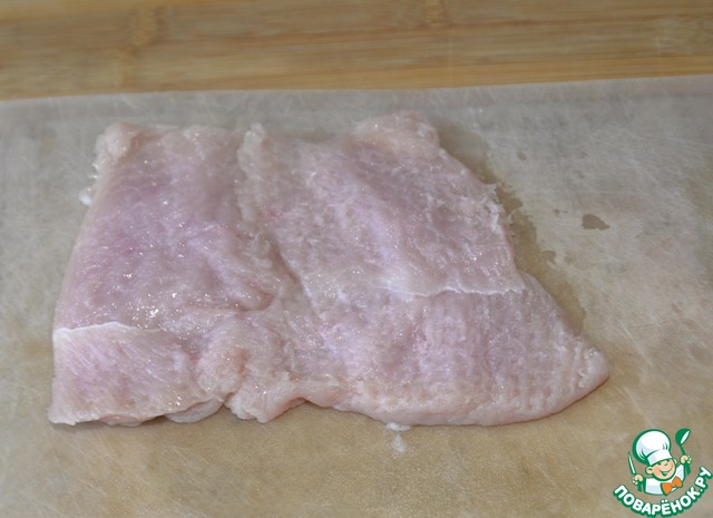 Грудку индейки моем, обсушиваем бумажным полотенцем. Вырезаем порционные куски (пласты) весом около 300 гр, слегка отбиваем.