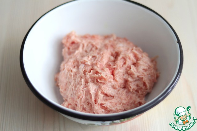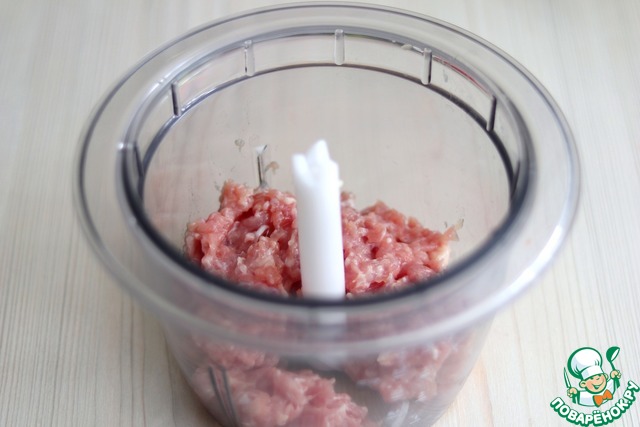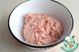 В чашу чоппера-измельчителя добавить филе грудки индейки (200 гр.). Далее добавить соль и черный молотый перец по вкусу.