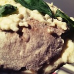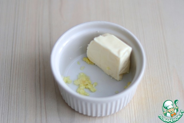 В миску добавить сливочный сыр (50 гр.), пропустить 1 зуб. чеснока через чесночный пресс. Сливочный сыр растереть с чесночной кашицей до однородного состояния.