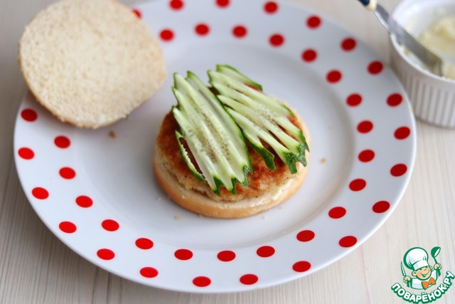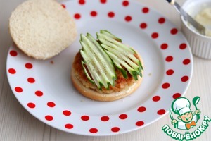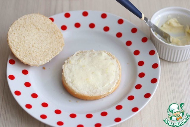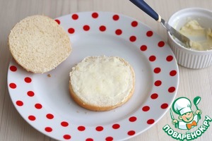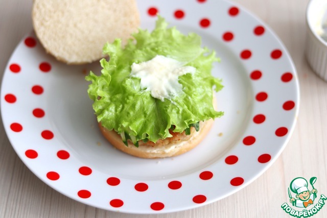 Далее добавить листья салата. Листья салата смазать слегка чесночно-сливочным сыром и всю конструкцию прикрыть верхней частью булочки для гамбургеров.