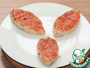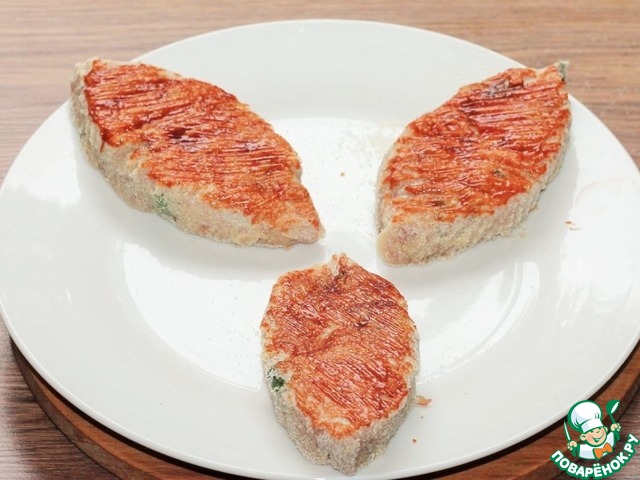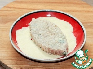 7. Мокрой ложкой берем порцию фарша, макаем в взболтанный вилкой яичный желток и обваливаем в семолине (или мелкой манной крупе). Формируем котлеты.