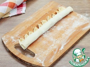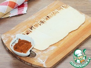 4. Каждую часть теста, раскатываем и увеличиваем в 2 раза. С одного края нарезаем небольшие полоски, ~ 2 см.