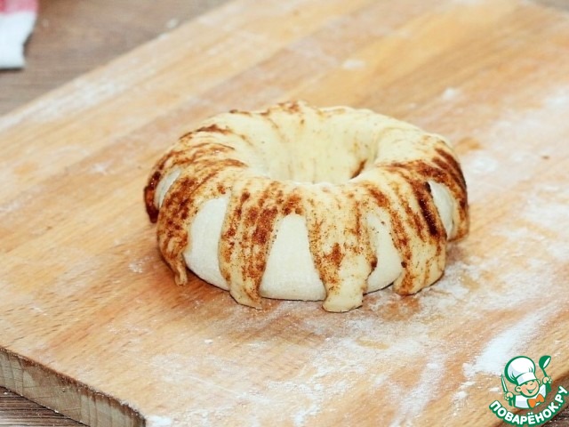10. Соединяем два конца рулета. Кончик рулета, который будет внутри, смазываем взбитым яйцом.