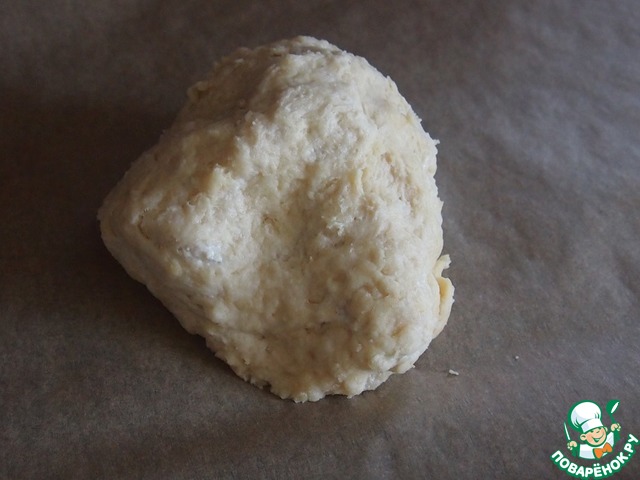 • В миске смешать муку, разрыхлитель и соль. Добавить желтки, размешать. Добавить подсолнечное масло и воду. Замесить элластичное, немного липковатое тесто.