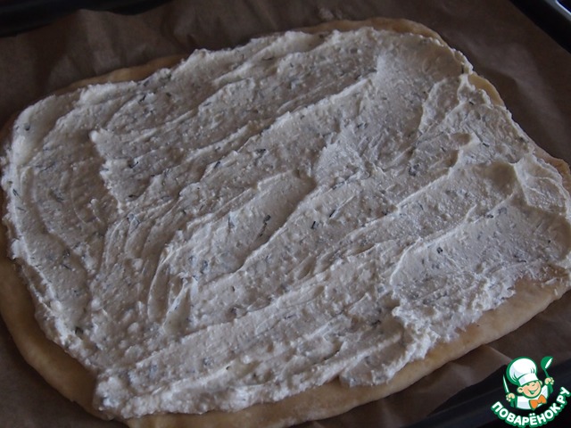 • Раскатать тесто в пласт и положить его на противень, застеленный бумагой для выпечки. На тесто поместить начинку и распределить его по всей поверхности.
