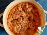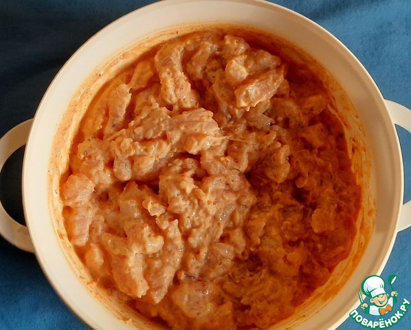 Добавить йогурт к мясу, хорошо перемешать, убрать в холодильник для маринования на 1-2 часа, можно дольше. У меня стояло ночь. |