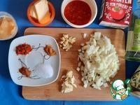 Приготовить ингредиенты для соуса. Одну луковицу мелко нарезать, чеснок и имбирь тоже мелко нарезать (я нарезала мелкими шайбами, мы любим, когда попадаются кусочки) |