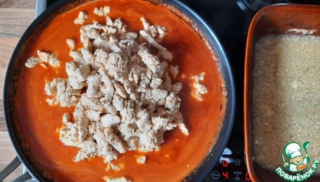 Через 20 минут готово и мясо и соус. Достать мясо и добавить в соус, хорошо перемешать, потушить 2 минуты. |