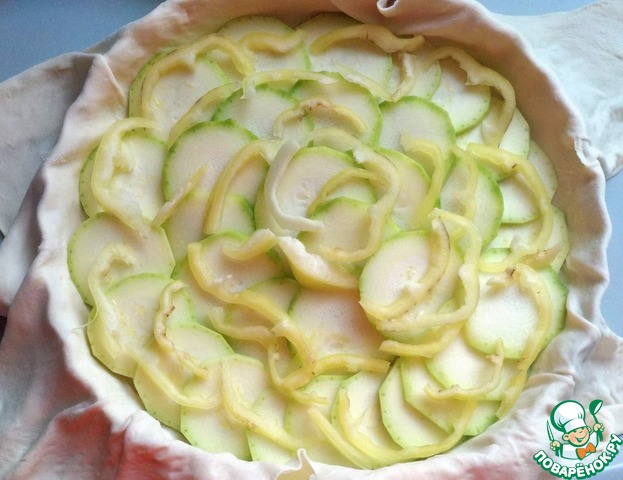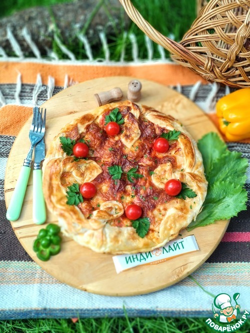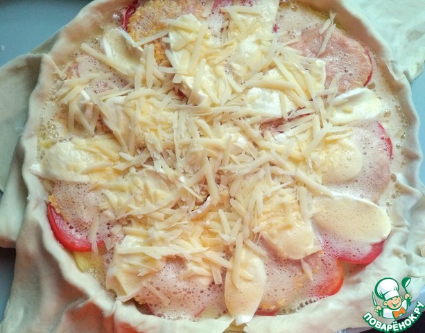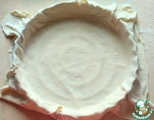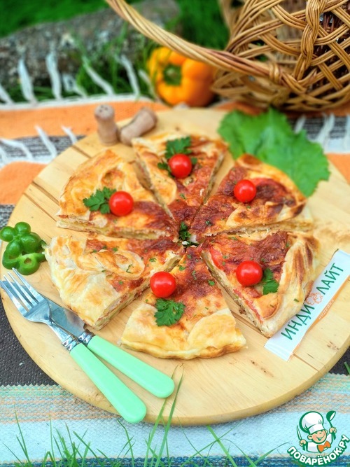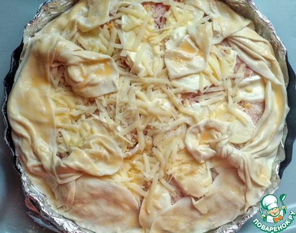 Количество ингредиентов рассчитано на 2 пиццы диаметром 28-30 см. Слоёное тесто предварительно разморозить, раскатать, как можно тоньше. Форму для выпечки при необходимости застелить фольгой или пергаментом, сверху накрыть тестом, что бы края немного свисали.