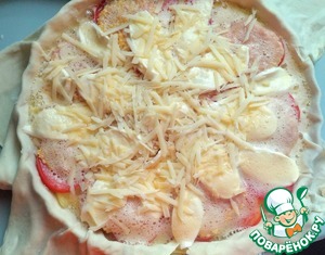 Залить пиццу яичной массой. Сверху натереть сыр на крупной тёрке.