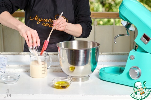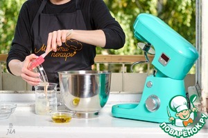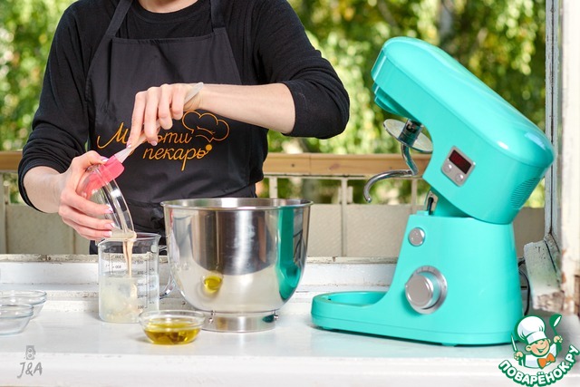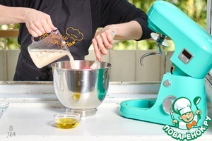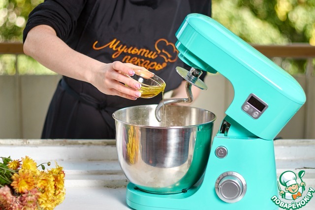 В отдохнувшее тесто влить масло и вымешать до гладкости и появления глютеновых нитей минут 10-15 (зависит от мощности миксера, руками еще дольше)