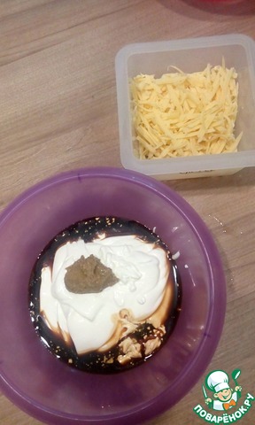 • Тем временем готовим соус для заливки. Смешиваем сметану, горчицу, соевый соус и добавляем натертый на крупной терке сыр.
