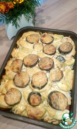 • Форму для запекания смазываем маслом и укладываем овощи слоями. Картофель, цуккини, баклажаны, помидоры, лук. Потом слой мяса и далее в обратном порядке. Ставим форму в разогретую до 180 гр. духовку и запекаем 20 минут.