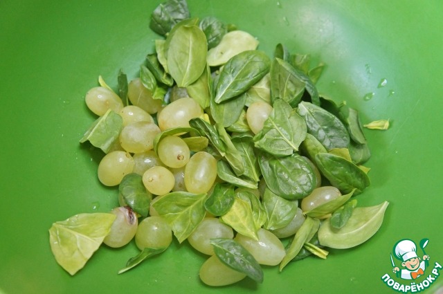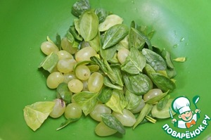 Шпинат вымыть и стряхнуть воду, отрезать стебельки. Виноград вымыть и снять ягоды с веточек. Сложить все в миску.