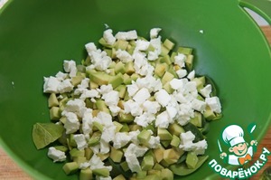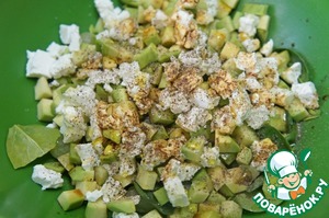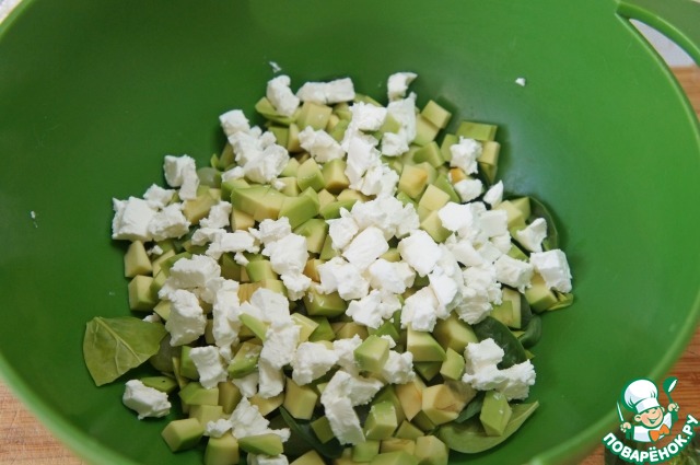 Авокадо очистить, удалить косточку, мякоть нарезать небольшими кубиками. Добавить к салату.
