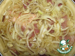 Лук нарезаем полукольцами и укладываем на слой мяса.