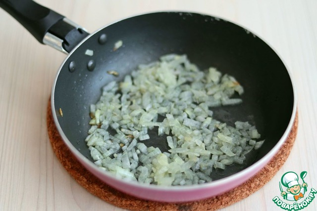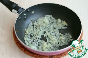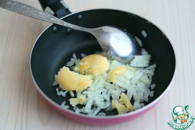 Репчатый лук нарезать мелкими кубиками. На сковороду добавить 1 ст. ложку топленого сливочного масла.
