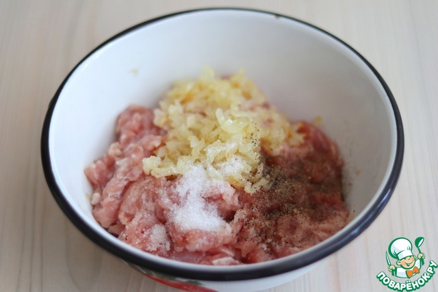 В фарш из мяса индейки добавить соль и черный молотый перец по вкусу, добавить припущенный репчатый лук. Фарш хорошо вымешать.